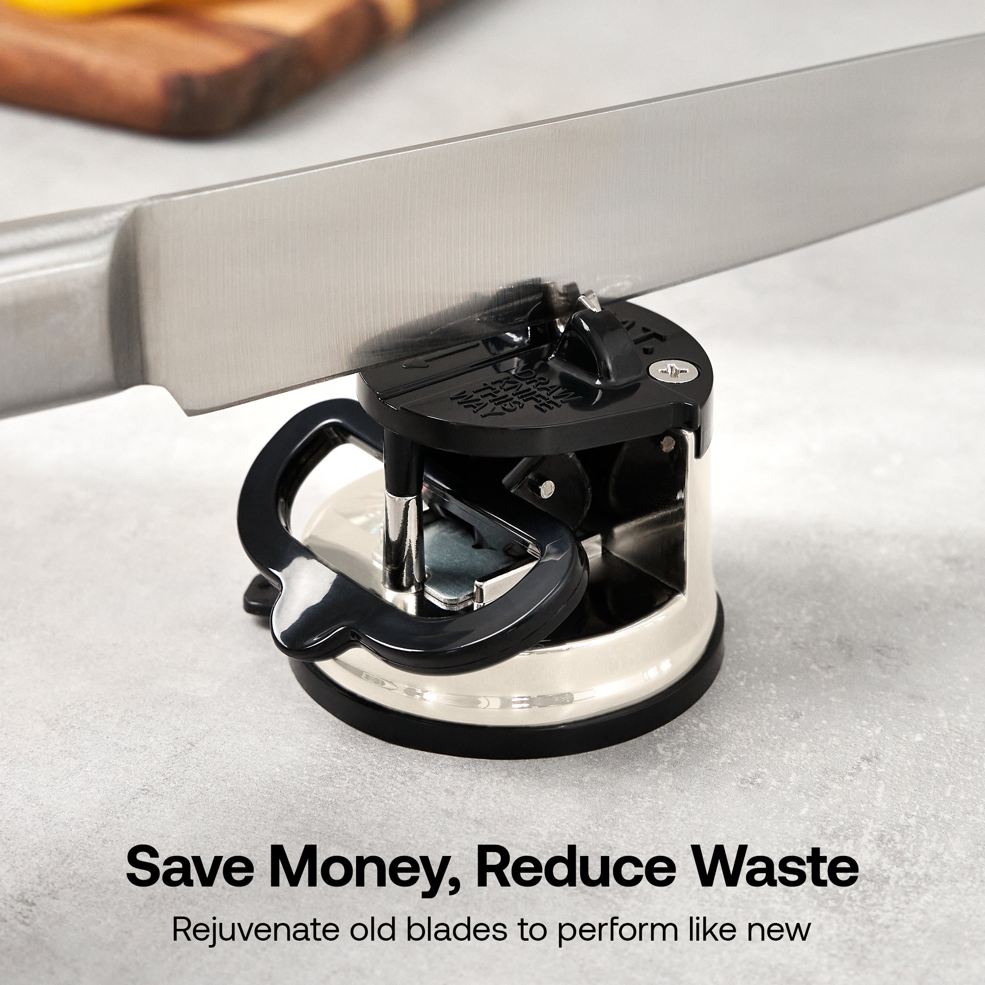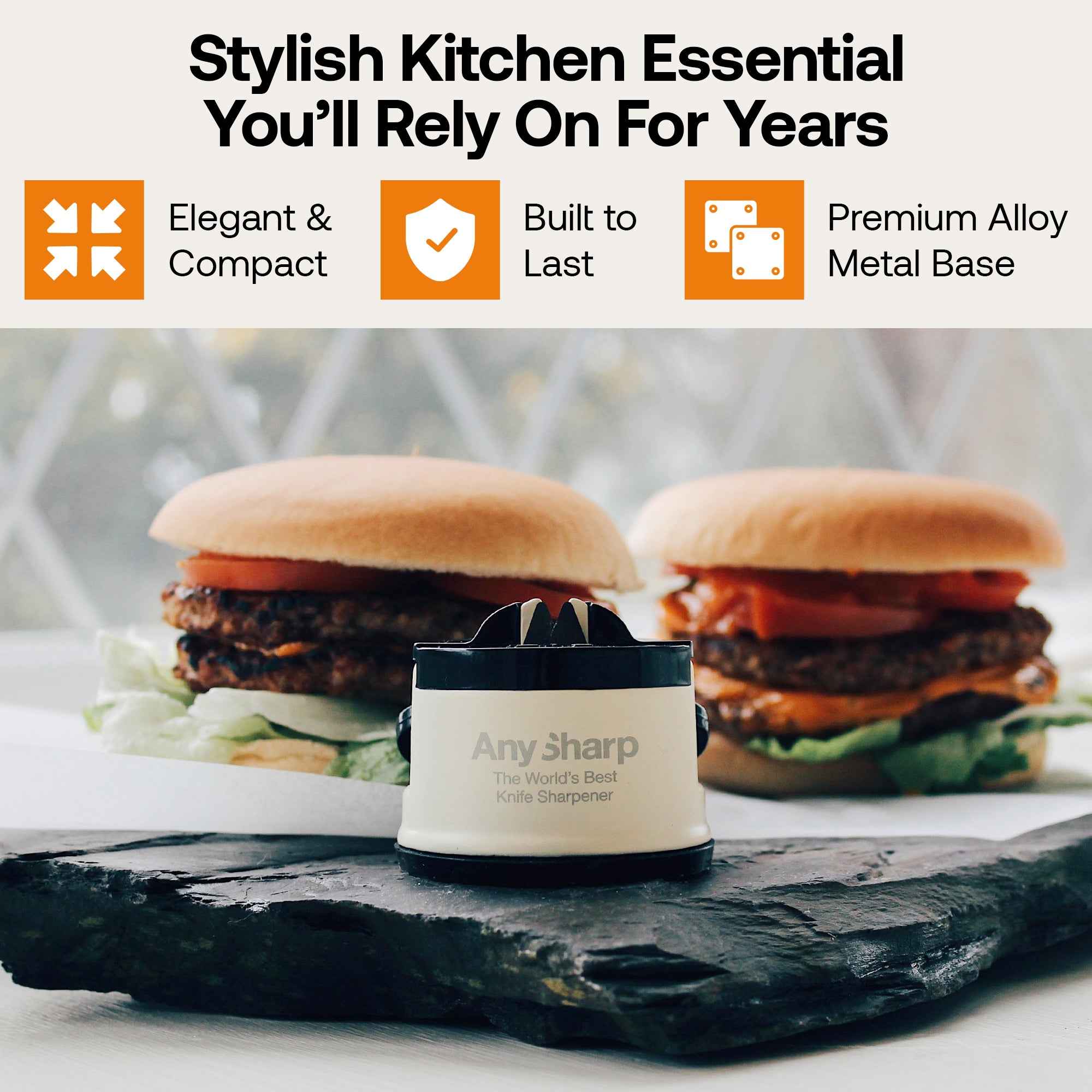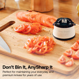 Transform dull knives into precision cutting tools with the AnySharp Editions Knife Sharpener. Pre-set at the optimal 20-degree angle and equipped with tungsten carbide edges, it delivers professional results without requiring special skills. The unique PowerGrip suction base ensures safe, controlled sharpening by securely attaching to any smooth surface, protecting you and your finest blades. AnySharp Editions Knife Sharpener is a versatile sharpener that can handle most of your knives, from everyday kitchen knives to hardened steel and serrated edges. Elegant and compact, Editions features a strong plastic body, making it a durable sharpener that helps extend your knives' lifespan for years, saving money and reducing waste. Don't Bin It, AnySharp It!