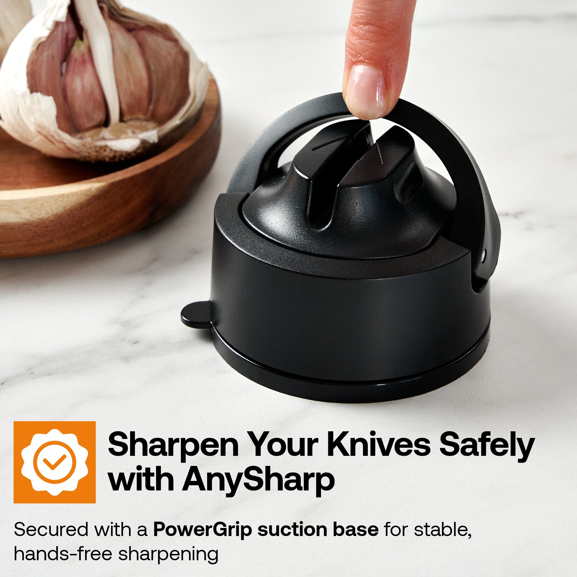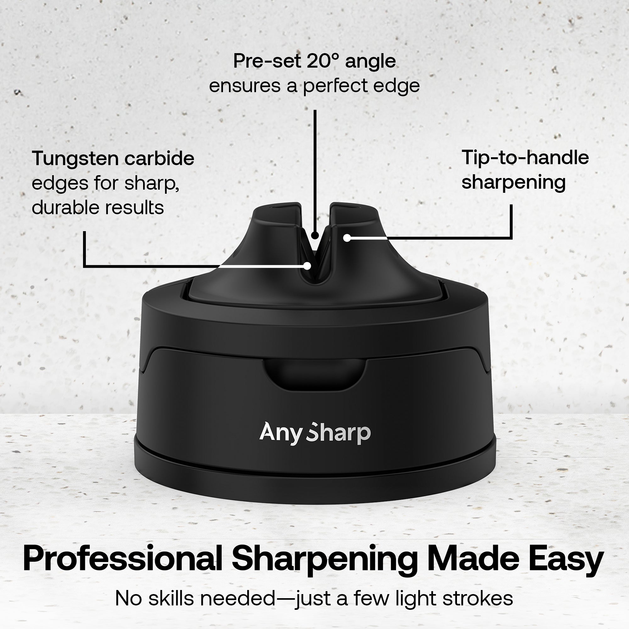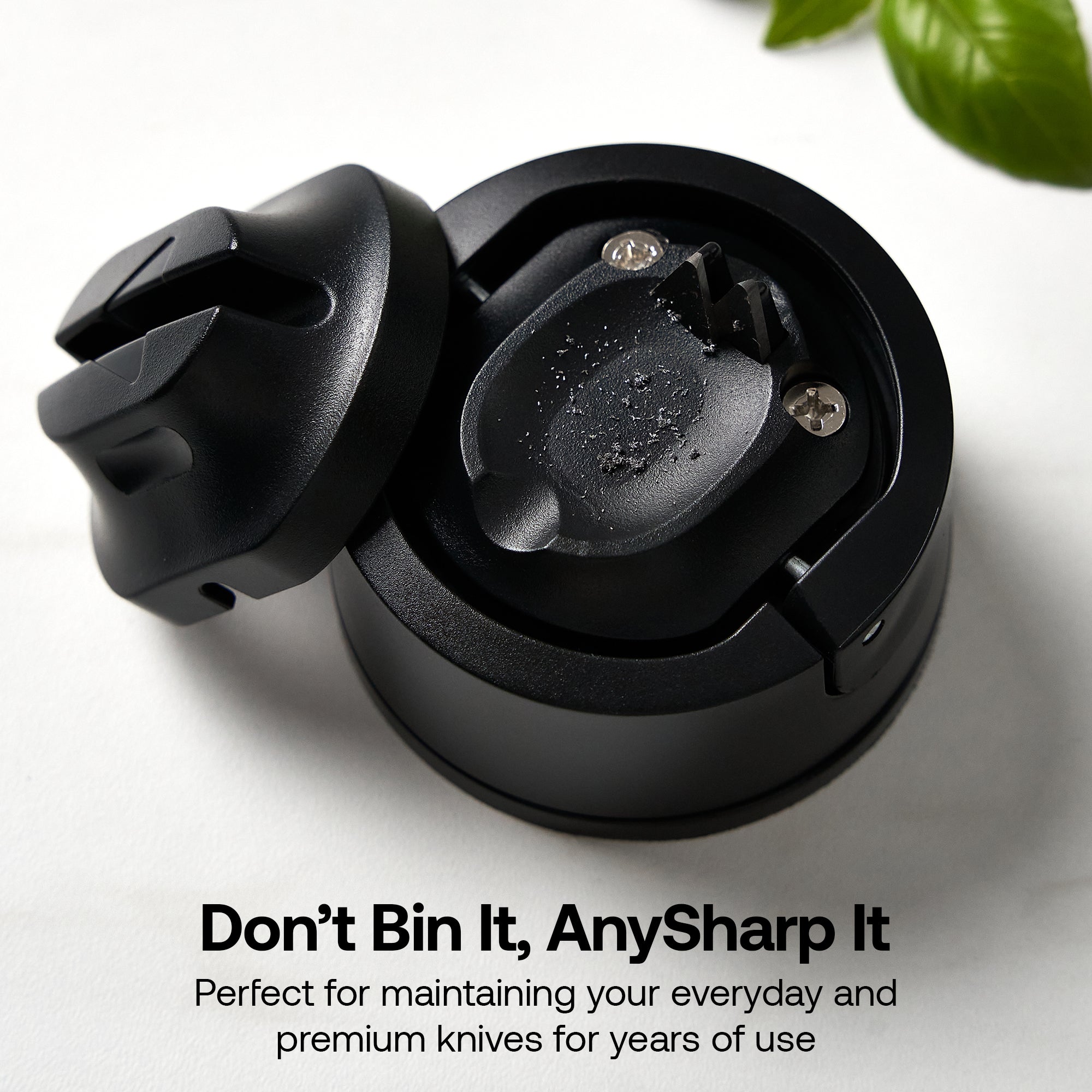 Transform dull knives into precision cutting tools with the AnySharp EVO Knife Sharpener. Pre-set at the optimal 20-degree angle and equipped with tungsten carbide edges, it delivers professional results without requiring special skills. The unique and improved PowerGrip suction base ensures safe, controlled sharpening while the collection tray is included to keep your kitchen clean from metal filings. AnySharp EVO is a versatile small knife sharpener that can handle most of your blades, from everyday kitchen knives to hardened steel and serrated edges. Elegant and compact, Evo features an updated modern aesthetic and a stunning matte finish, making it a durable kitchen knife sharpener that helps extend your knives' lifespan for years, saving money and reducing waste. Don't Bin It, AnySharp It!