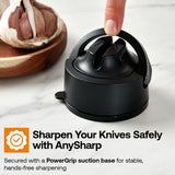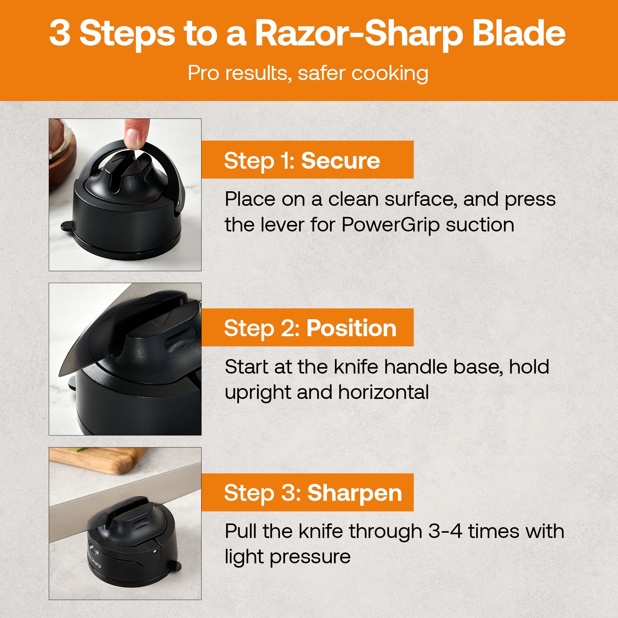 • Hands-Free Safety with PowerGrip Suction: No slipping, no risk—the secure suction base of the knife sharpener locks to smooth surfaces, keeping your hands safely away from the blade. Perfect for seniors, beginners, and busy cooks.